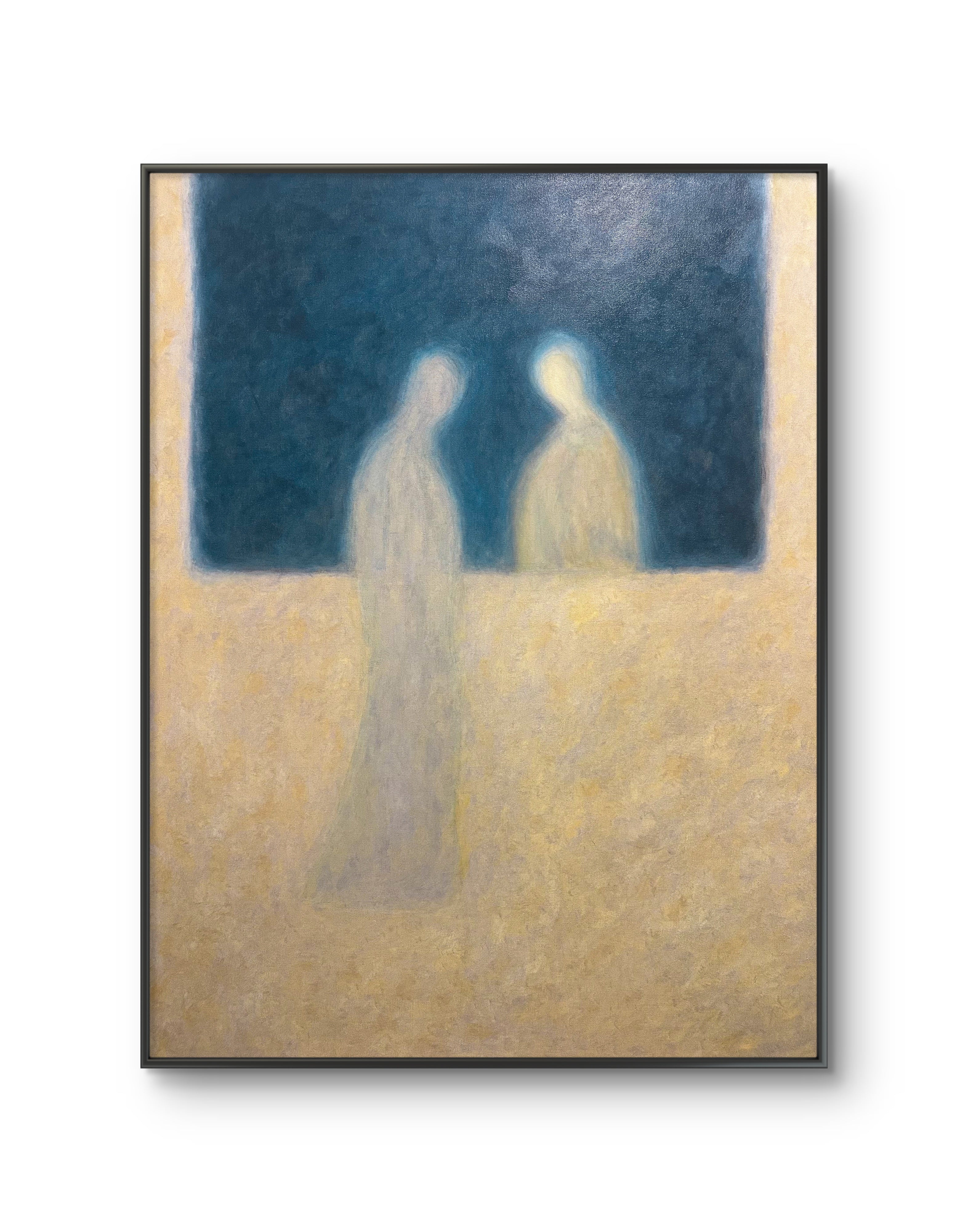 The figures are not depicted; they are constructed. Through controlled geometry, restrained color palettes, and carefully measured negative space, the work transforms form into a quiet, spatial experience. These shapes echo interiors—walls, thresholds, windows—suggesting how presence is felt within space rather than how it is seen.