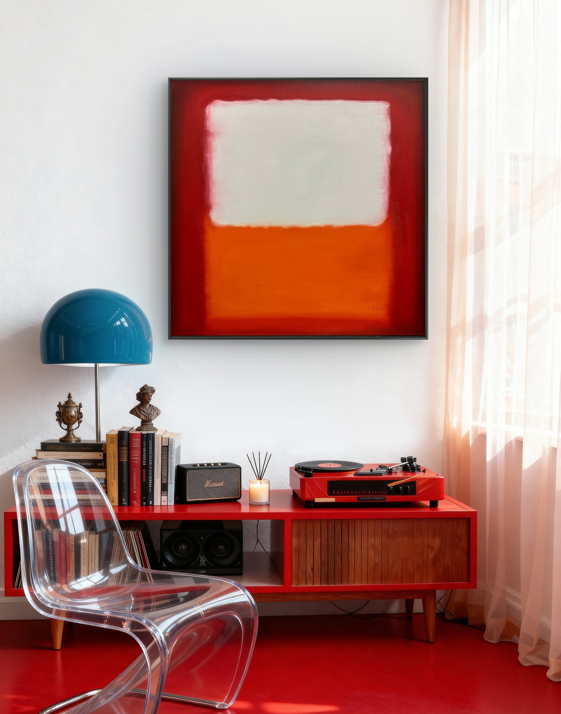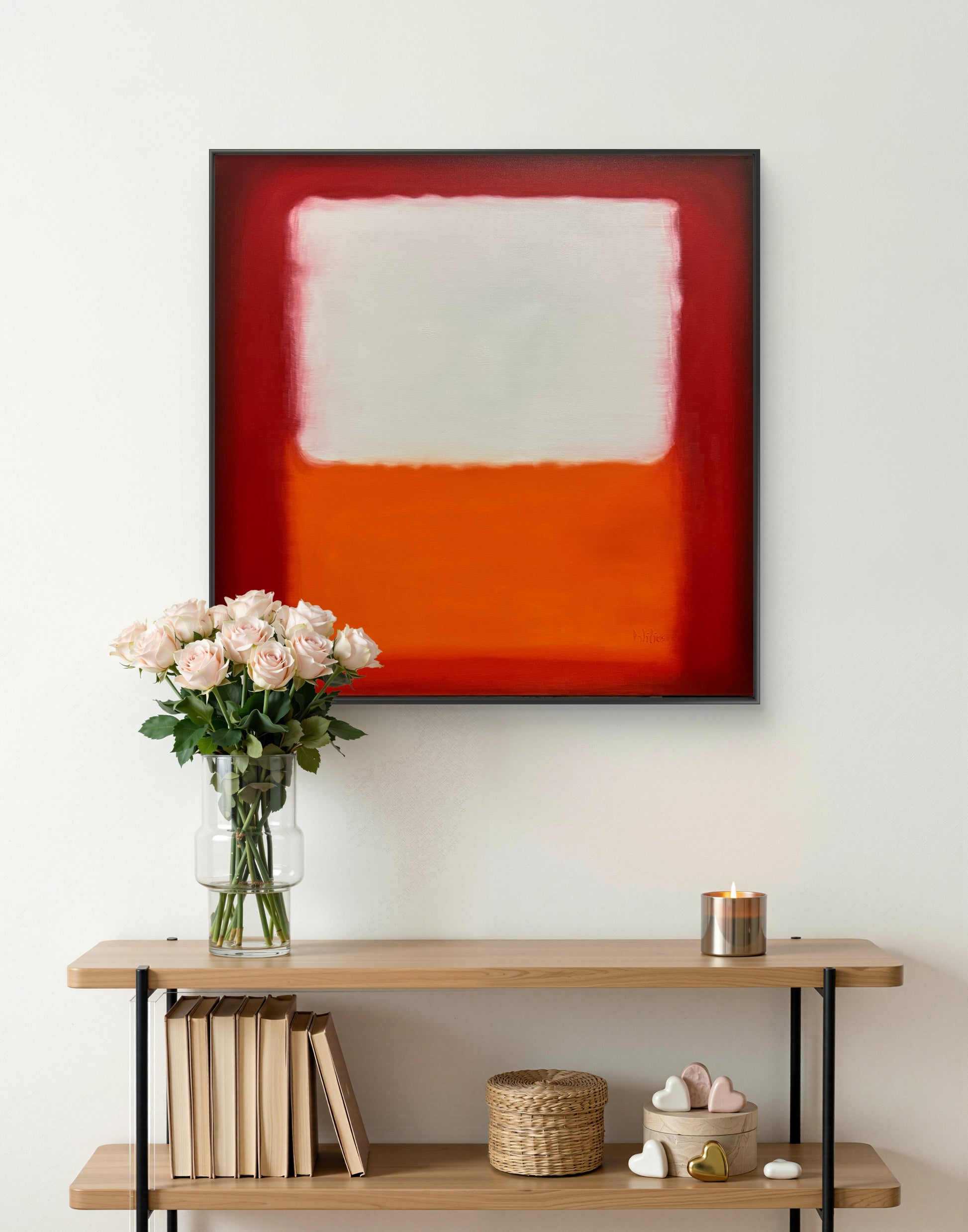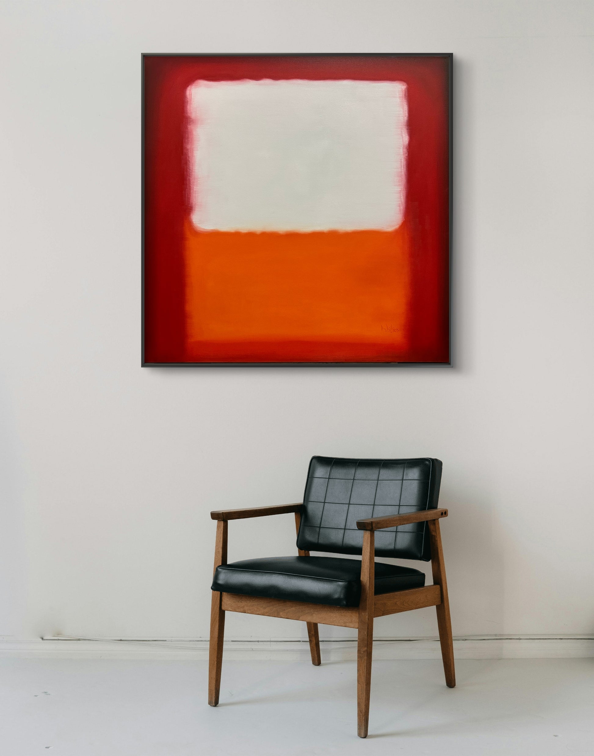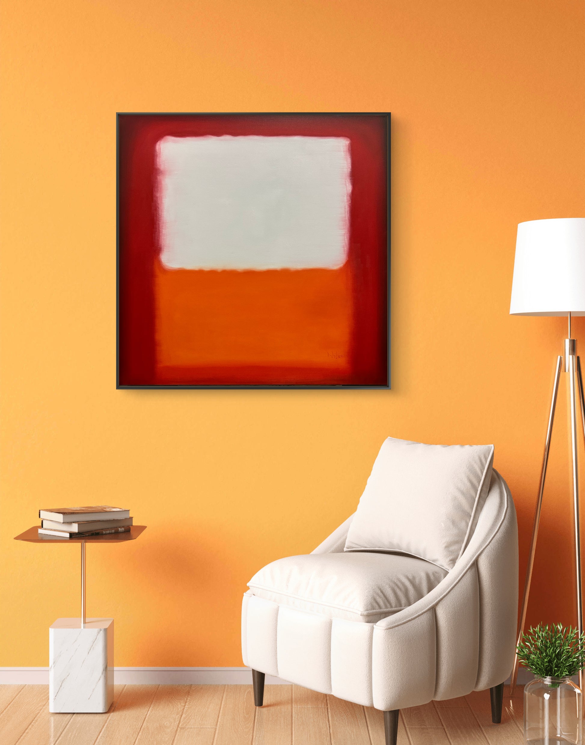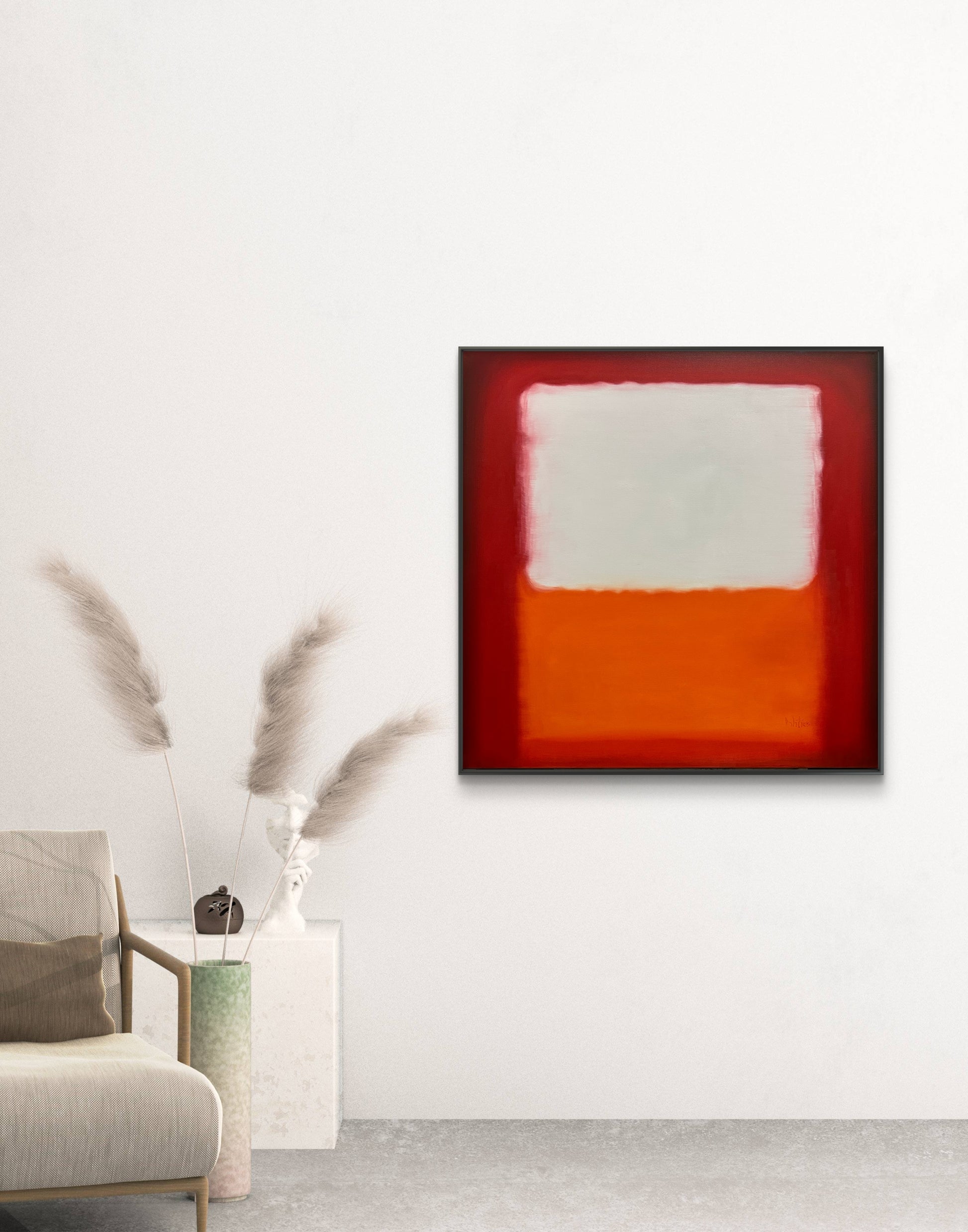 This work draws the viewer into a subtle emotional dialogue through luminous color fields and softened boundaries. The deep reds hold the composition like a quiet frame of intensity, while the central ivory plane feels suspended—almost breathing—above a grounded layer of warm orange. The blurred transitions evoke memory, silence, and internal landscapes, allowing the piece to shift emotionally depending on light, space, and mood.