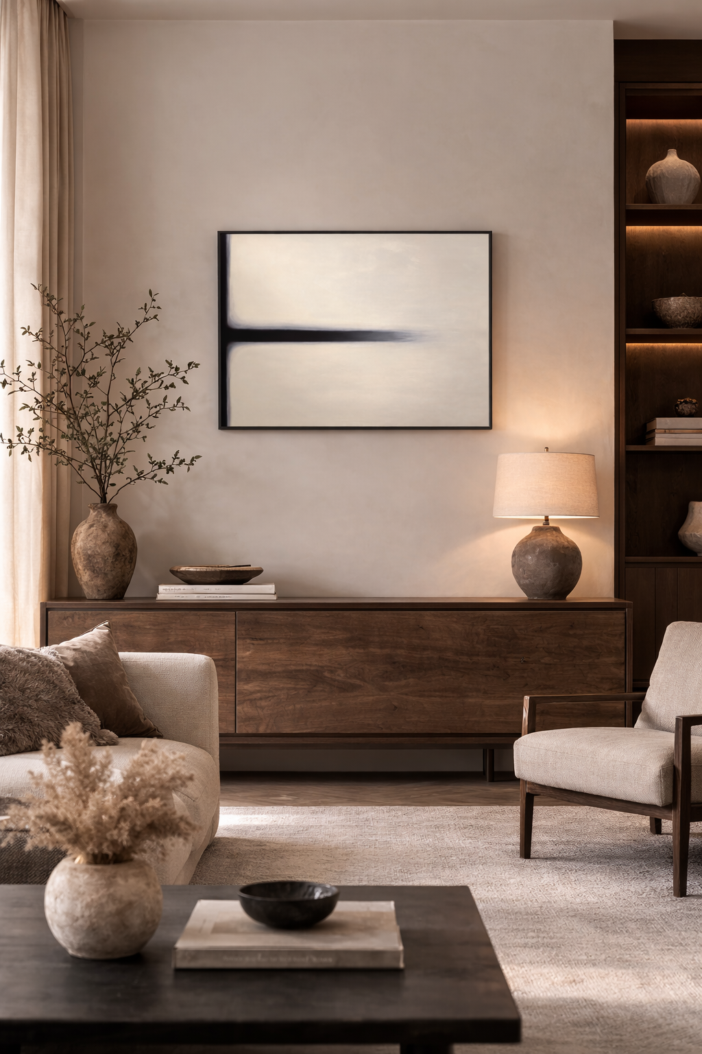The Silent Axis explores the tension between stillness and force. A single horizontal line cuts through a soft, atmospheric field, creating a quiet yet powerful sense of balance and division. Minimal in form yet rich in presence, the piece invites reflection on boundaries—both seen and unseen—while bringing a refined, contemporary elegance to any space.